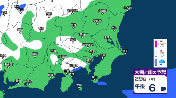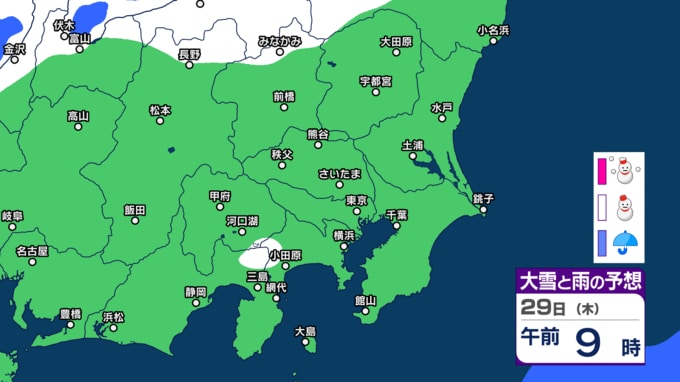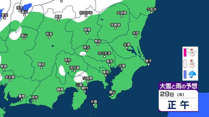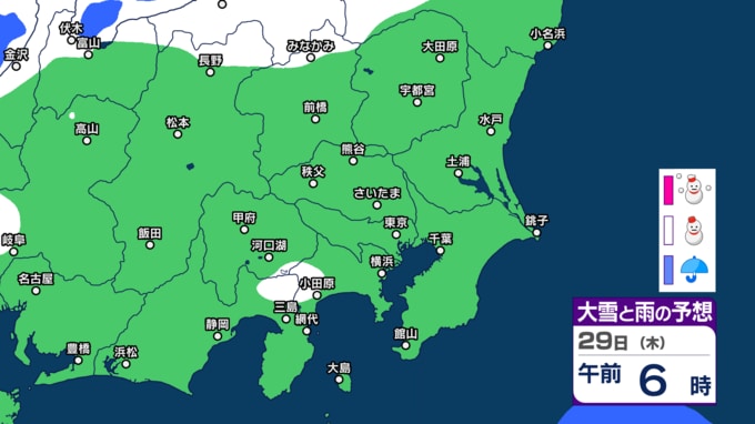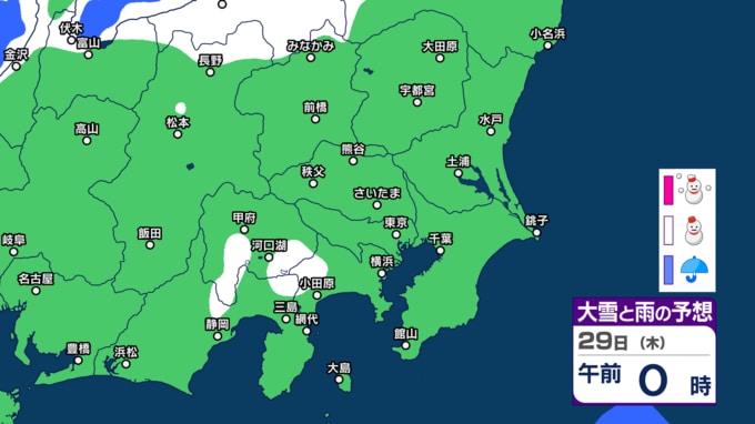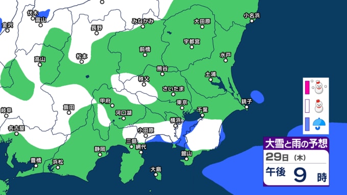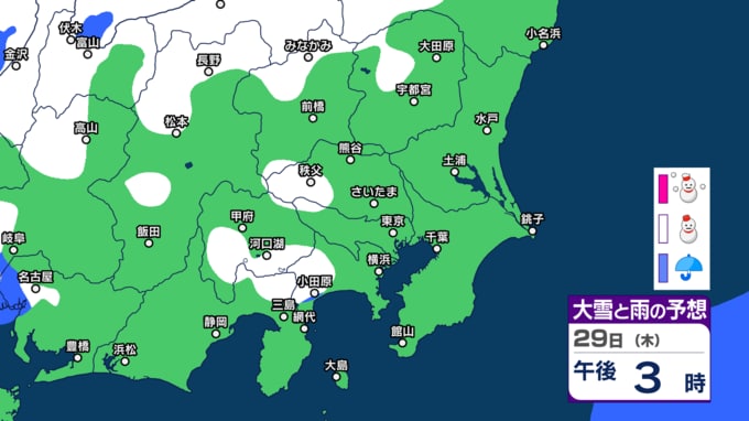 気象庁によりますと、29日の東京地方は、北部は曇りで雪の降る所がある見込みです。