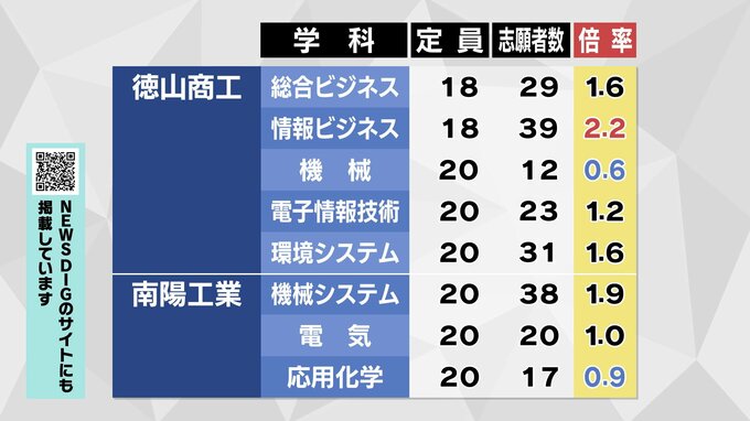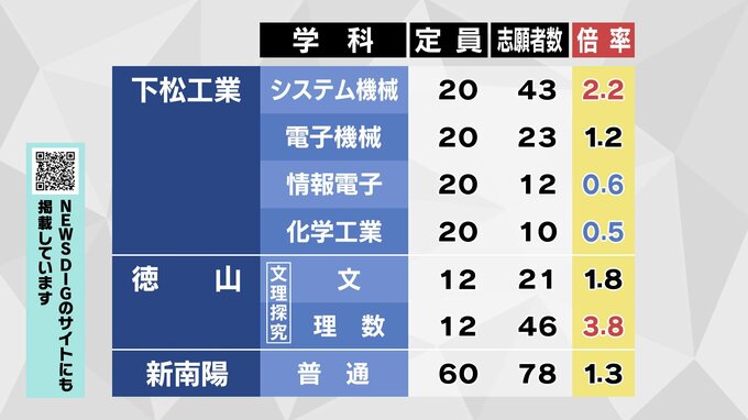 【全校掲載】山口県公立高校入試2026 “特色選抜”志願倍率発表 山口・文理探究3.4倍 徳山は文1.8倍理数3.8倍 全日制1.4倍 【1月28日発表】 テレビ山口 2026年1月28日(水) 17:00 国内 徳山 文理探究の文1.8倍、理数3.8倍