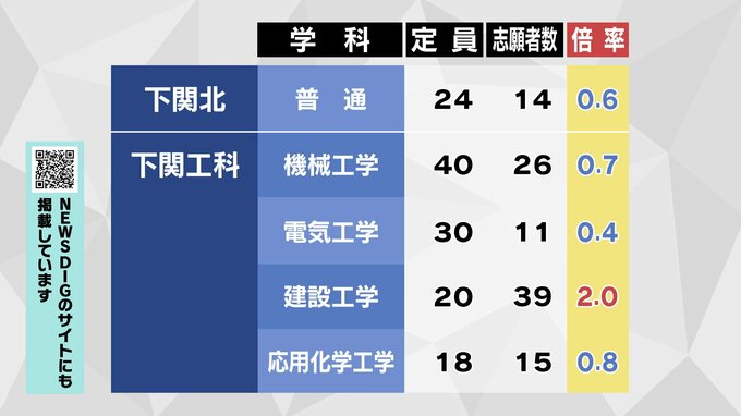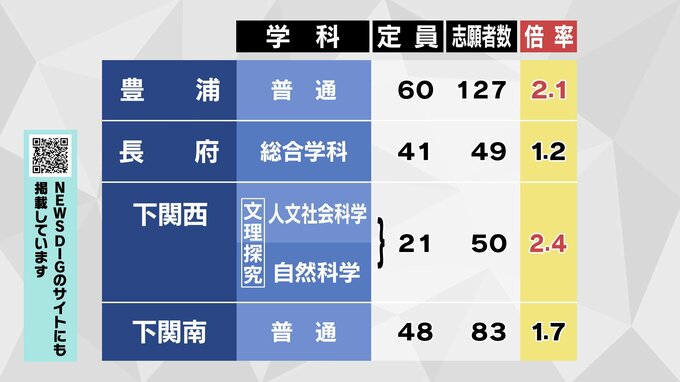 【全校掲載】山口県公立高校入試2026 “特色選抜”志願倍率発表 山口・文理探究3.4倍 徳山は文1.8倍理数3.8倍 全日制1.4倍 【1月28日発表】 テレビ山口 2026年1月28日(水) 17:00 国内 下関西 文理探究は2.4倍