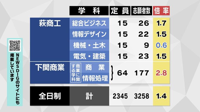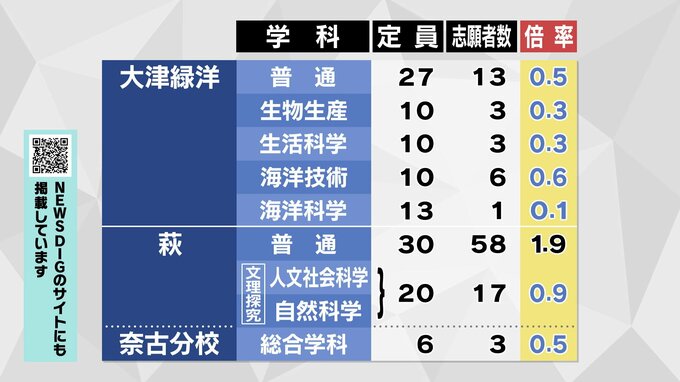 【全校掲載】山口県公立高校入試2026 “特色選抜”志願倍率発表 山口・文理探究3.4倍 徳山は文1.8倍理数3.8倍 全日制1.4倍 【1月28日発表】 テレビ山口 2026年1月28日(水) 17:00 国内 大津緑洋・普通は0.5倍 萩・普通は1.9倍