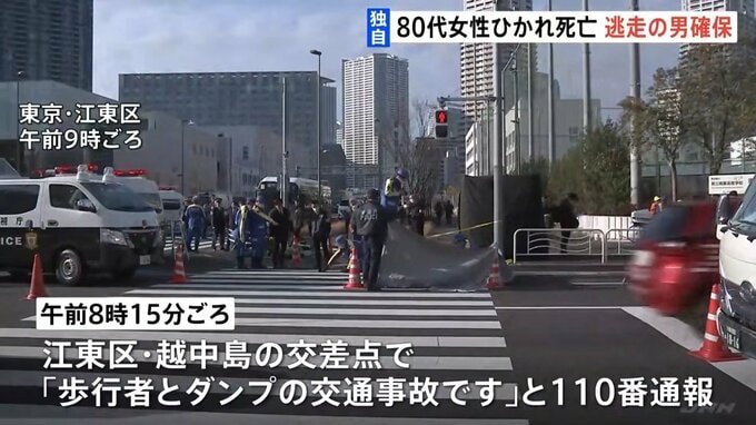 けさ、東京・江東区で80代の女性がダンプカーにひかれ、死亡しました。ダンプカーは逃走しましたが、先ほど運転手の男の身柄が確保されました。