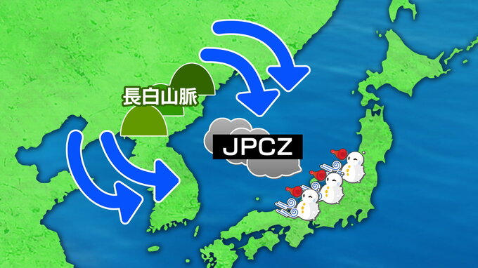 JPCZとは大陸から吹く北西からの季節風が、朝鮮半島北部の長白山脈を迂回した後、日本海で合流してできる帯状の発達した雪雲のことです。日本海側に大雪をもたらすことで知られています。