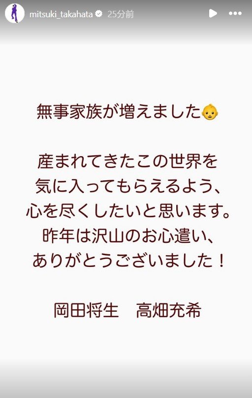 そして「昨年は沢山のお心遣い、 ありがとうございました!」「岡田将生 高畑充希」と、その喜びを綴っています。