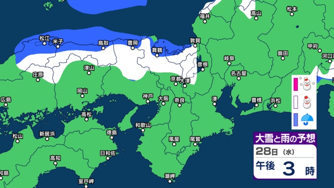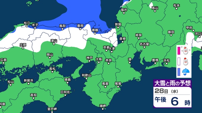 28日の近畿地方は、寒気や湿った空気の影響でおおむね曇り、北部では断続的に雪や雨が降るでしょう。