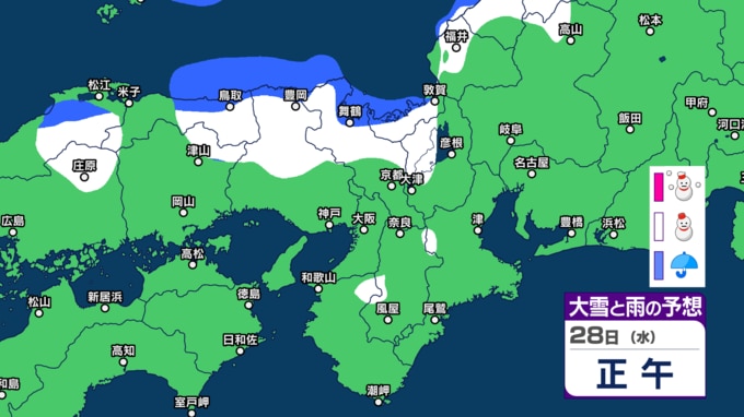 28日の滋賀県は、寒気や湿った空気の影響でおおむね曇り、北部では雪の降る所があるでしょう。