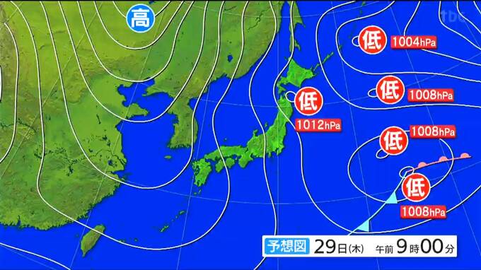 29日午前9時の予想天気図です。西高東低の冬型の気圧配置が続き、28日よりも上空の寒気が強まるため、日本海側を中心に大雪になる所もありそうです。