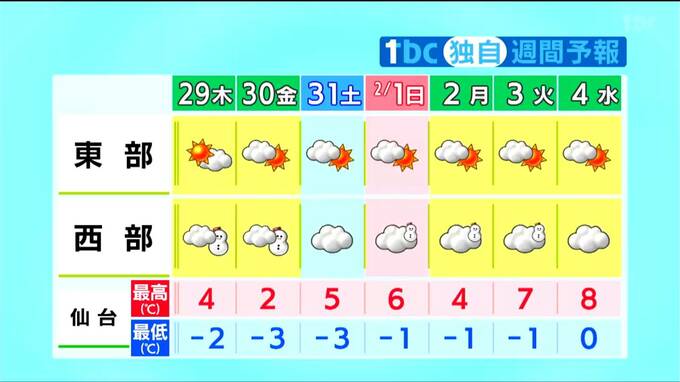 最低気温は氷点下2℃から氷点下6℃と、28日朝と同じかやや低く、路面や水道管の凍結に注意が必要です。最高気温は1℃から4℃と、28日と同じくらいまでしか上がらず平年よりやや低いでしょう。