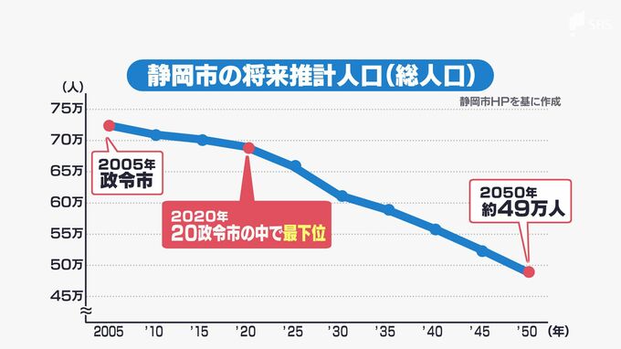 静岡市が2025年に発表した推計人口によると、2020年には全国20の政令市の中で人口が最下位に転落。このままのペースでいけば、2050年には50万人を割り込むと試算されています。