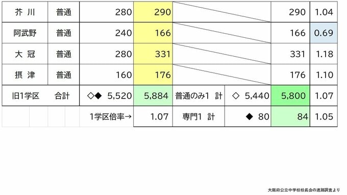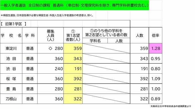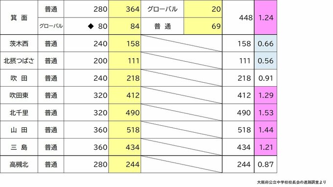 【大阪府公立高校入試2026】茨木2.12倍、春日丘2.03倍・・・北野ほか各高校の倍率は? 私立の専願率が年々増加傾向【高校受験1月発表 全校掲載 令和8年度進路希望調査】 毎日放送 2026年1月28日(水) 18:16 国内 【旧第1学区】山田1.44倍 桜塚1.09倍 学校別の倍率