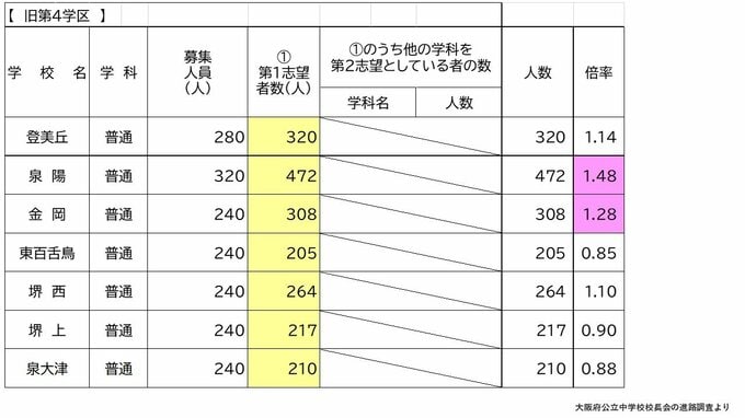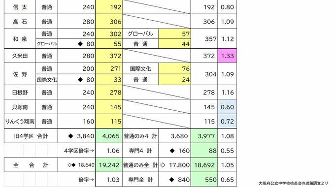 【大阪府公立高校入試2026】茨木2.12倍、春日丘2.03倍・・・北野ほか各高校の倍率は? 私立の専願率が年々増加傾向【高校受験1月発表 全校掲載 令和8年度進路希望調査】 毎日放送 2026年1月28日(水) 18:16 国内 【旧第4学区】泉陽1.48倍 久米田1.33倍 学校別の倍率