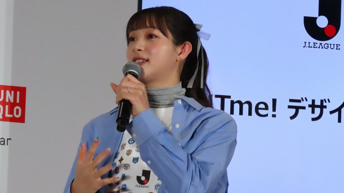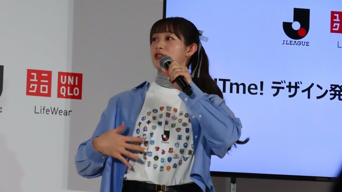 Jリーグ名誉女子マネージャーに就任している足立さん。今回のユニクロとJリーグのコラボについて〝大好きなユニクロと、大好きなJリーグっていうところのコラボレーションはすごく楽しみなところではありますし、そういう発表会に私出ていいんだって。光栄です。〟と喜びました。