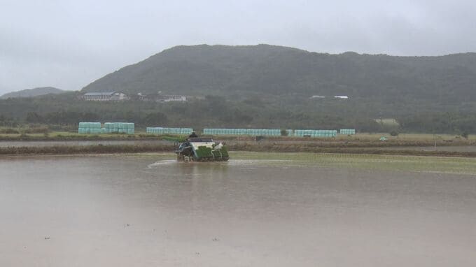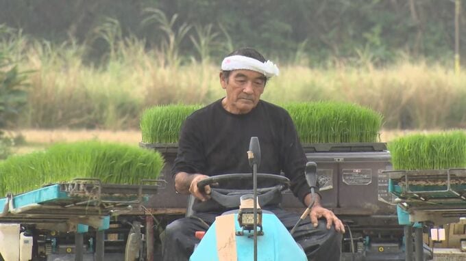 27日、田植えを行ったのは、石垣市崎枝で稲作を営む大濵永太郎さん(70)です。大濵さんは小雨の降るなか、15センチほどに成長した「ひとめぼれ」の苗を田植え機に積み込み、水を張った水田に植え付けました。