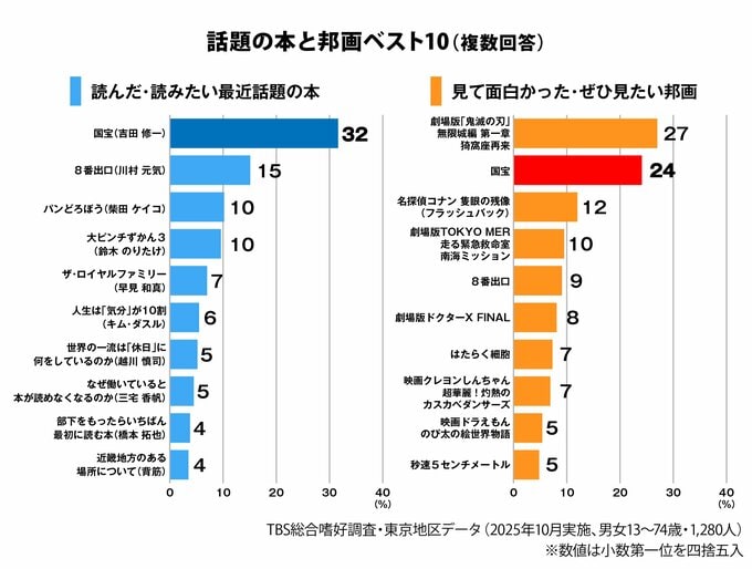 これを見ると『国宝』は、小説では断トツのトップ、邦画ではアニメ「劇場版『鬼滅の刃』無限城編第一章猗窩座再来」(25年7月18日公開)に次ぐ2位。実に3人に1人が小説を「読んだ・読みたい」、4人に1人が映画を「見て面白かった・ぜひ見たい」と回答した計算です。