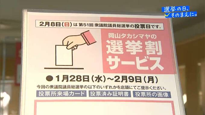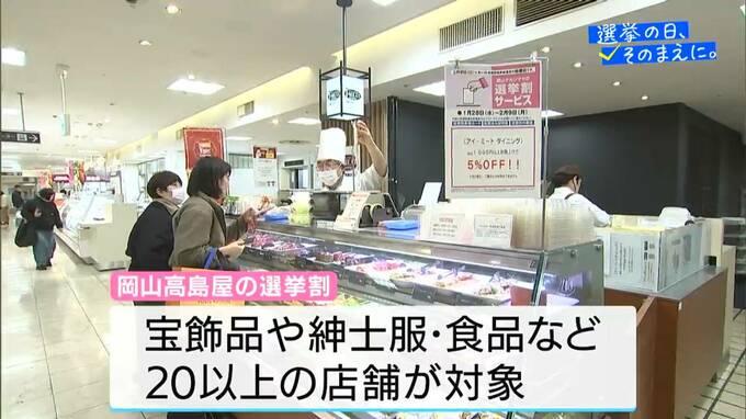 きょうからはじまった「選挙割」です。10%割引となるダイヤモンドのほかに、紳士服や惣菜を含めた食品まで、20以上の店舗でサービスが受けられます。選挙への関心を高め、投票率の向上につながればと、岡山高島屋では今回、初めて行なわれます。