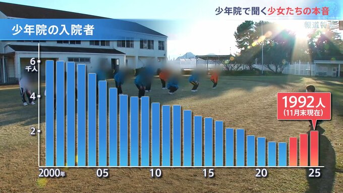 2000年以降、少年院の収容者は全国的に減少の一途を辿ってきた。だが、3年前から増加に転じ、2025年は1900人あまり。「丸亀少女の家」でも倍近くに増えている。