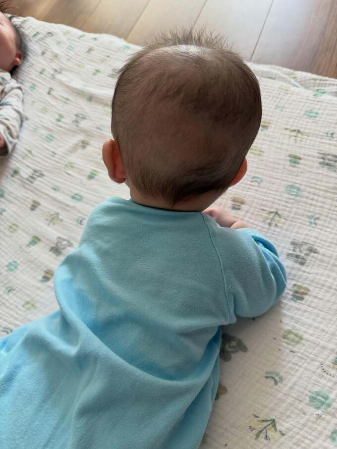 翔子さんは「弟くんがきのうからますます寝返りのコツをつかみ」「マスターしてしまったらしく」「一秒でも目を離したらコロンと寝返りうつ伏せ!」と、毎日見せる成長に喜びを表現しています。