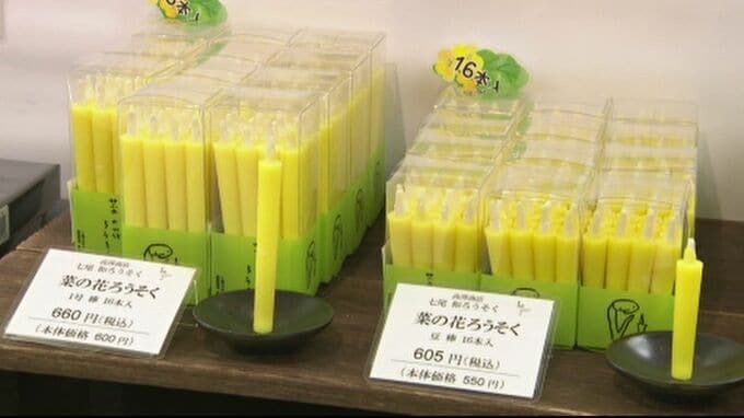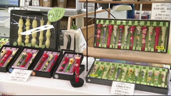 能登半島地震で店舗が全壊し、現在は仮設店舗で営業を続ける、石川県七尾市の「高澤ろうそく」も出店しています。買い物客に元気が出るようにと、ビタミンカラーのろうそくや、愛らしい花柄模様のろうそくが販売されています。