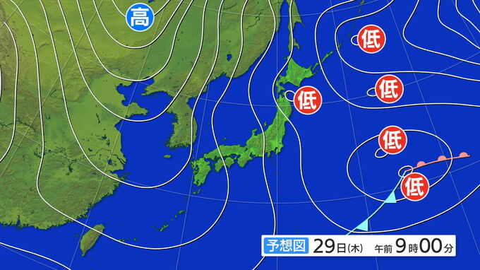 29日午前9時の予想天気図です。冬型の気圧配置で、日本海の西部には等圧線が西側に膨らんだ箇所があります。この周辺で雪雲が発生、発達しそうです。