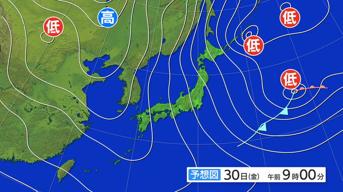 30日午前9時の予想天気図では、日本海の等圧線は縦にのび、その間隔が小さくなっています。北よりの風が日本海側では強まりそうです。