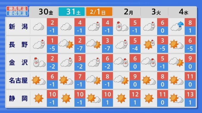 北陸では、29日から30日にかけて雪の降り方が強まりそうです。気温も低く、最低気温が氷点下の冬日が続きそうです。また、北よりの風が強まるでしょう。