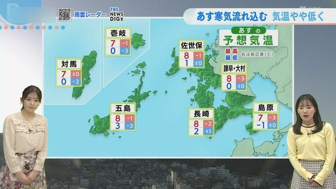 最低気温はマイナス1度から3度と冷え込む予想で、特に五島や壱岐、対馬では今日よりも2?3度低くなる予想です。