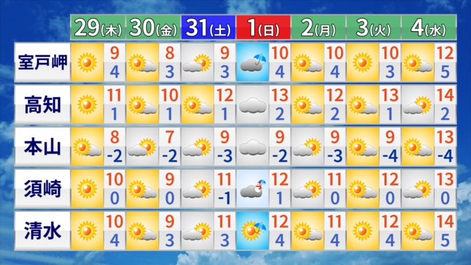 29日の高知県内は、高気圧に覆われて概ね晴れそうです。気温は寒気の影響で前日よりも低くなるところが多く、高知市で11℃前後となっています。山間部では雪の降るところがあるでしょう。路面の凍結に注意が必要です。