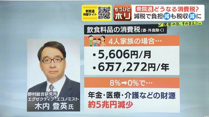 野村総合研究所のエグゼクティブ・エコノミスト、木内登英さんによりますと、軽減税率が適用されて8%となっている飲食料品の消費税を試算すると、4人家族の場合、