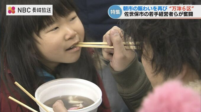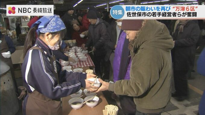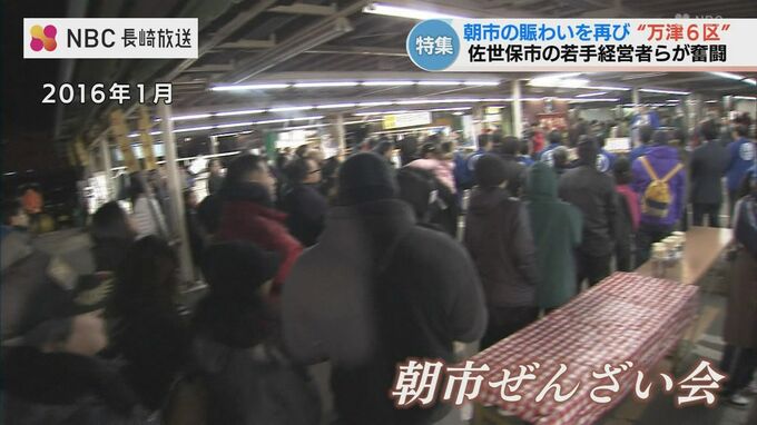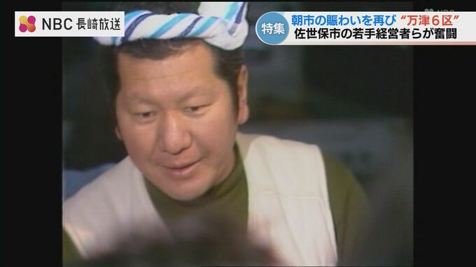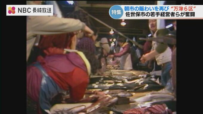 万津町の「佐世保朝市」は、終戦直後に獲れたての食材を夜明け前から持ち寄ったのが始まりです。威勢の良い声が飛び交い、最盛期には700店舗以上が軒を連ねていました。