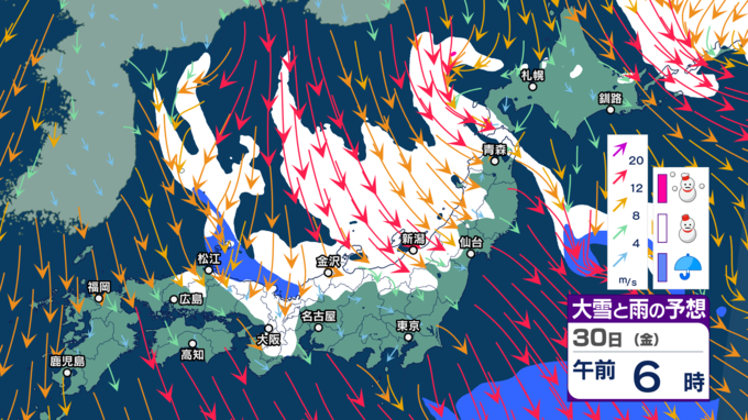 “第2波”ともされる強烈寒波が29日(木)頃から日本付近に流れ込んでくることが予想されていて、東北地方と東日本~西日本の日本海側を中心に大雪が予想されています。
