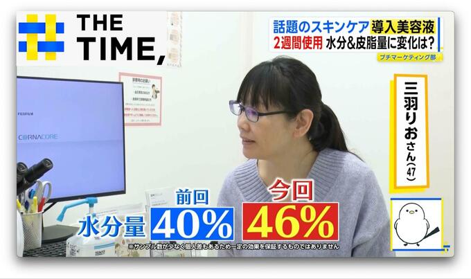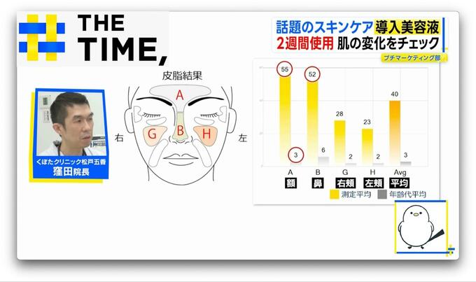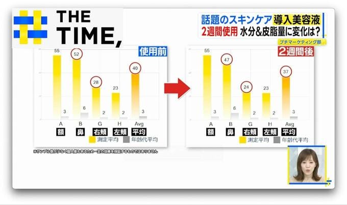 「番組スタッフの場合、導入美容液によって奥まで美容液がいく。“脂を作らなくてもいい”という形になる可能性が高いと考えられる。まだ2週間しか経っていないので継続していくといいと思う」