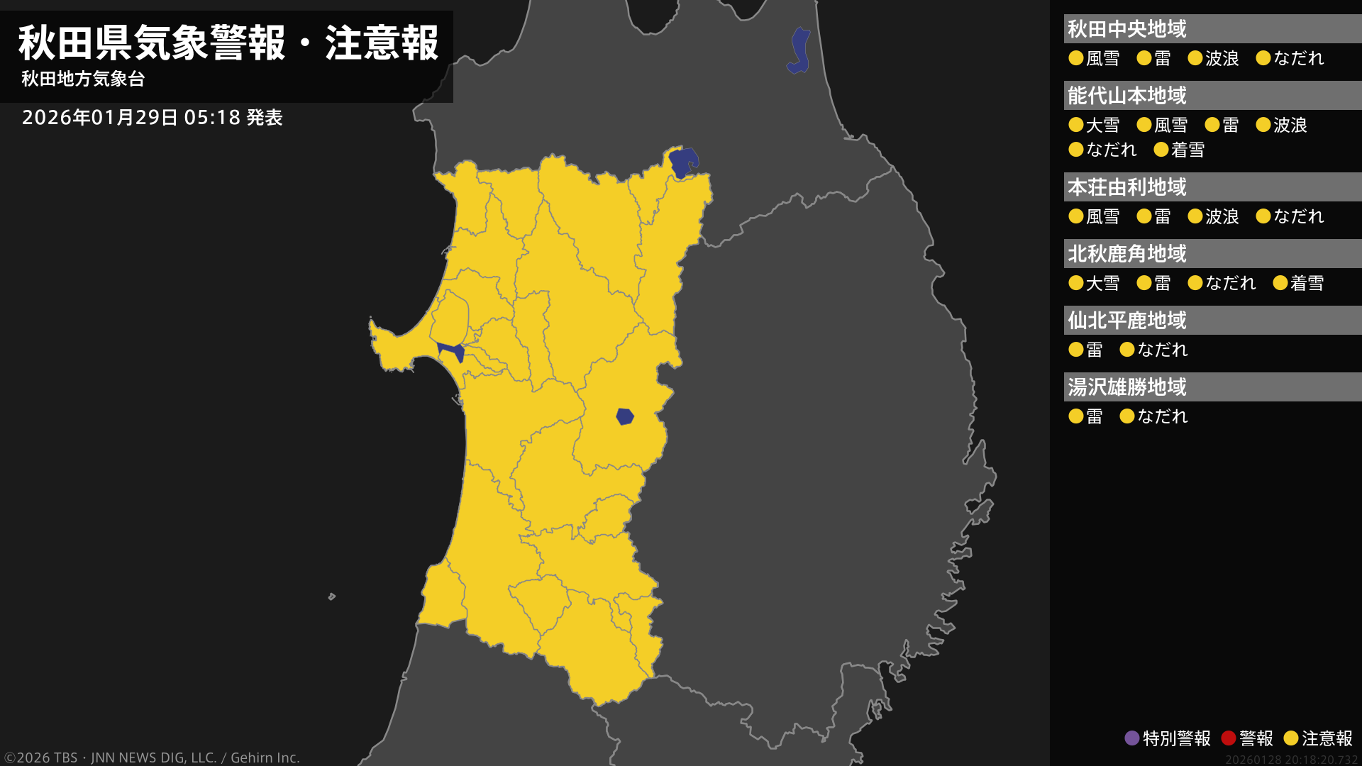 気象台は、午前5時18分に、なだれ注意報を秋田市、能代市、横手市、大館市、男鹿市、湯沢市、鹿角市、由利本荘市、潟上市、大仙市、北秋田市、にかほ市、仙北市、小坂町、上小阿仁村、藤里町、三種町、八峰町、五城目町、八郎潟町、井川町、美郷町、羽後町、東成瀬村に発表しました。