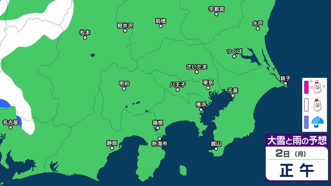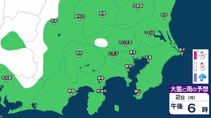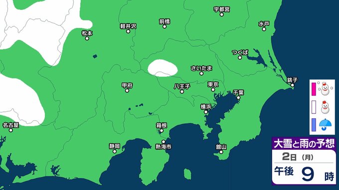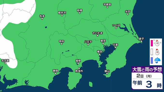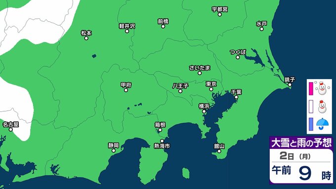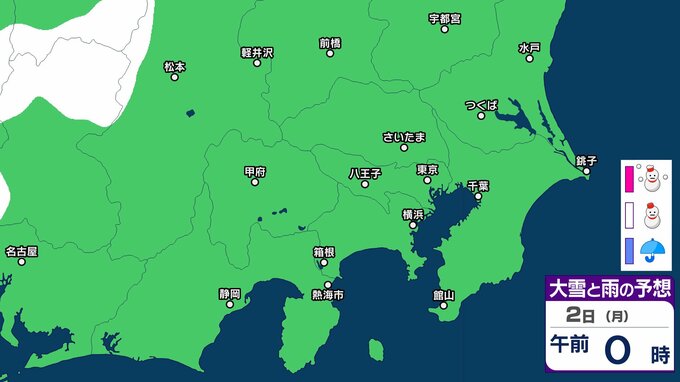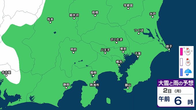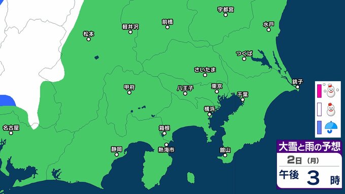 【雪】東京23区で1センチの降雪予報 29日夜遅くにかけて関東地方平野部でも積雪となるところが…東京、横浜、千葉、埼玉、つくば、栃木、群馬、山梨の2日までの雪雨シミュレーション【気象庁 29日発表】 RSK山陽放送 2026年1月29日(木) 09:03 国内 天気 2日(月) 【画像】【3日(火)までの雪雨シミュレーション】