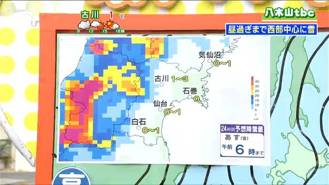 宮城県に関しては大雪になることはなさそうですが、30日明け方までの24時間予想降雪量は、西部の山沿い、特に大和町や加美町のあたりでは5cm以上積雪が増えていく可能性があります。平地でも古川周辺では2cm程度、さらに積雪が増える見込みです。