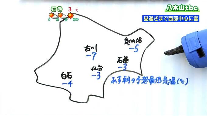 29日夜はまた冷え込みが強まり、30日朝の最低気温は仙台でも氷点下3℃、内陸では氷点下5℃以下のところも多くなりそうです。路面や水道管の凍結に注意が必要です。