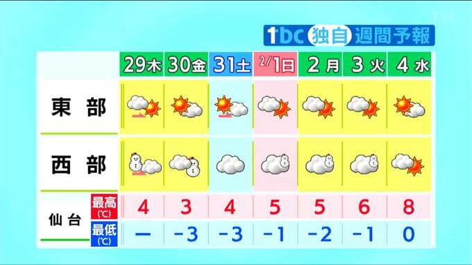 気温は30日が特に寒さ厳しく、最高気温3℃までしか仙台は上がらない予想です。その後は少しずつ寒さが緩んでいき、来週水曜日は仙台8℃と3月上旬並みまで上がりそうです。