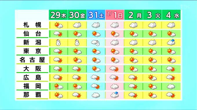 日本海側は30日金曜日にかけて警報級の大雪となるところがありそうです。その後も日本海側は雪が降りやすいですが、来週水曜日には新潟で雨マークがついており、来週の中頃は上空の寒気も少し弱まっていく見込みです。