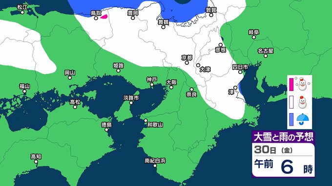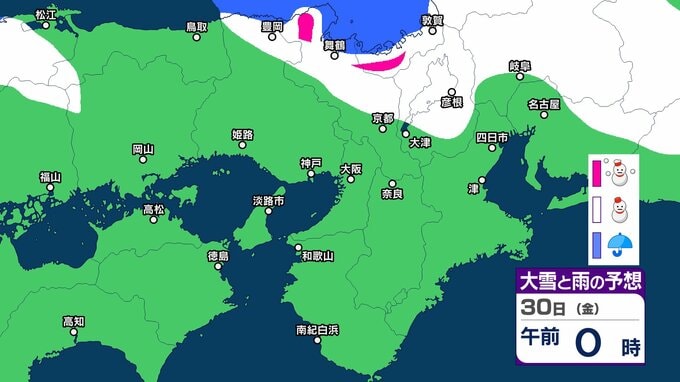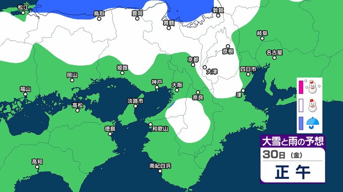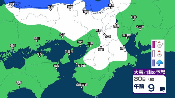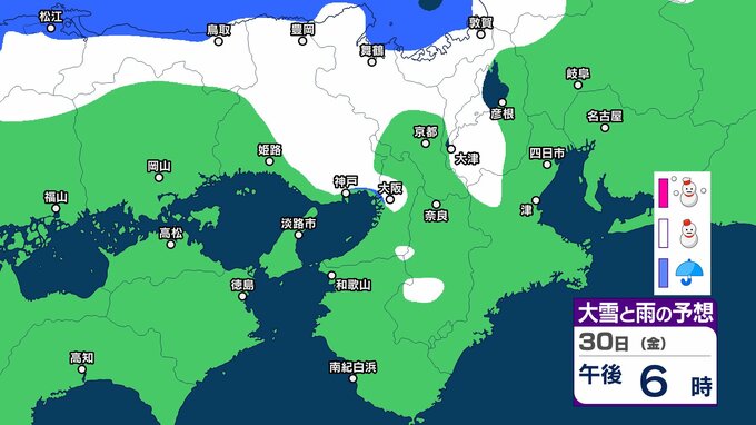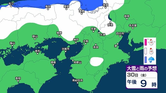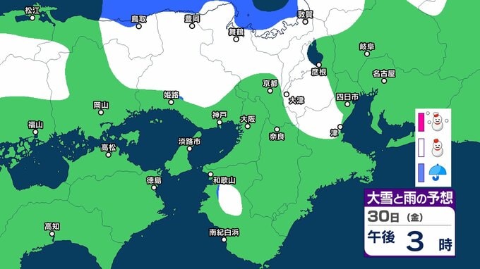 気象庁によりますと、近畿地方ではあす(30日)にかけて、上空約1500メートルに氷点下9度以下の強い寒気が流れ込み、冬型の気圧配置が強まる見込みです。