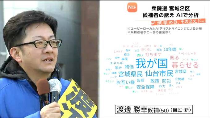 自民党の新人、渡邊勝幸さんです。最も大きいのは「我が国」という言葉です。また「暮らし」についても何度もふれ、安心した生活ができる国にすると訴えました。