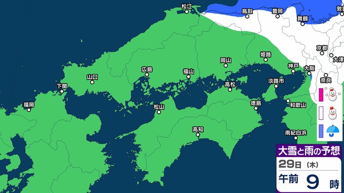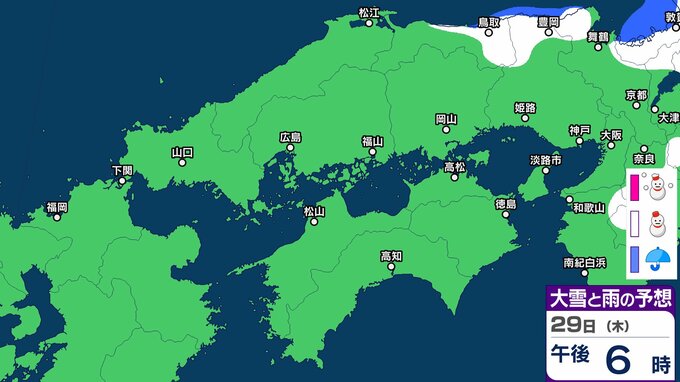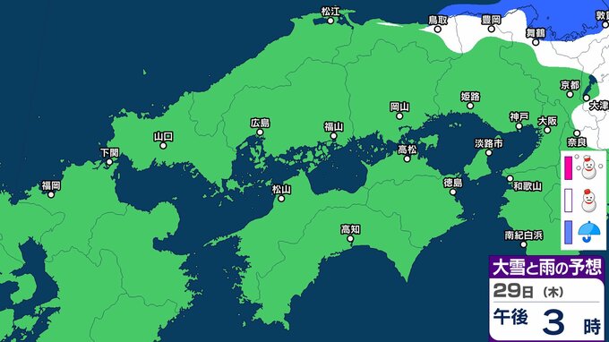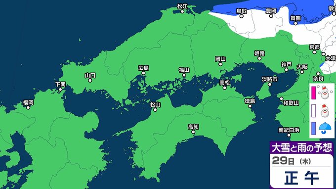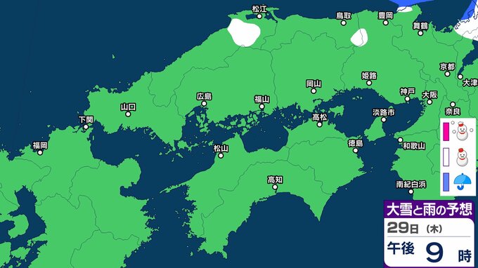 29日の広島県は、おおむね曇り、北部では雪の降る所がある見込みです。