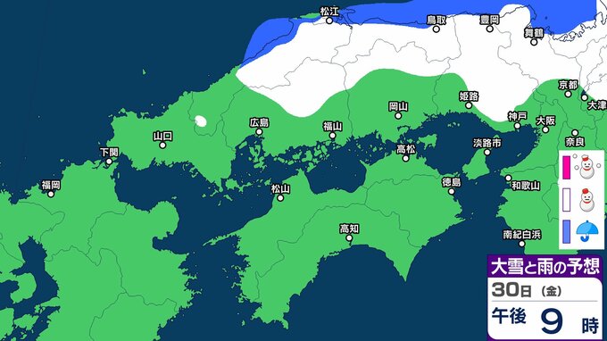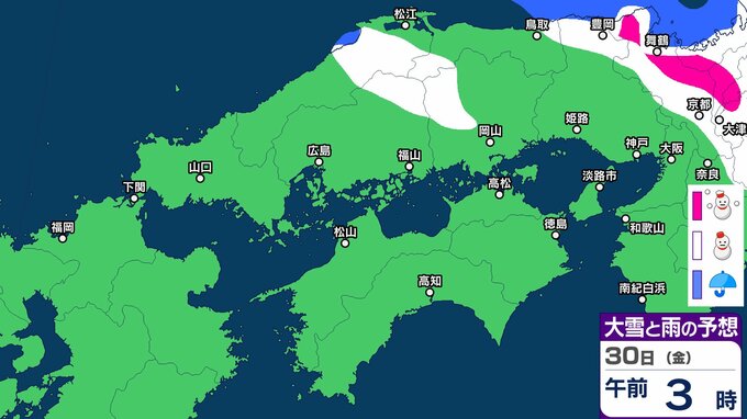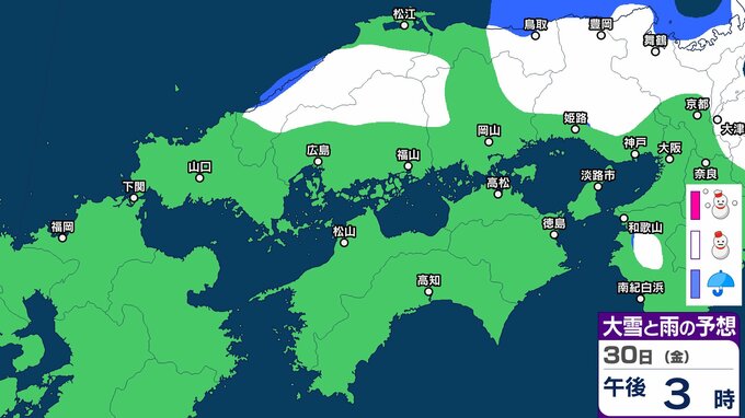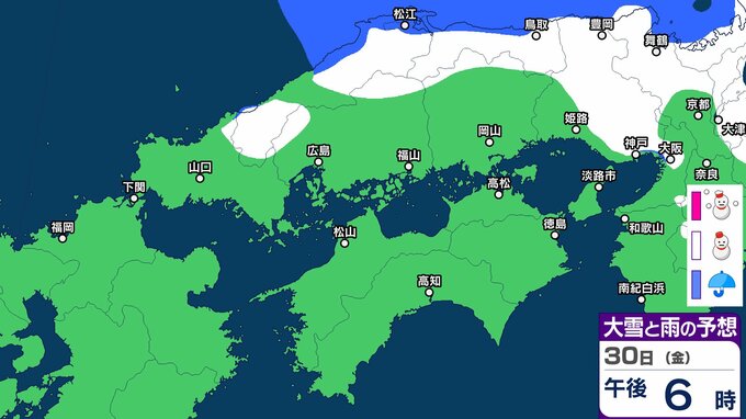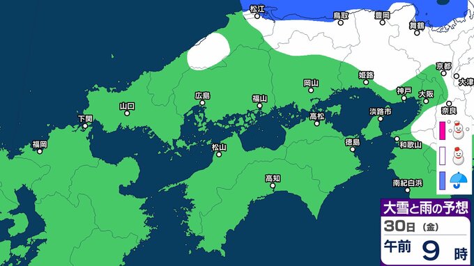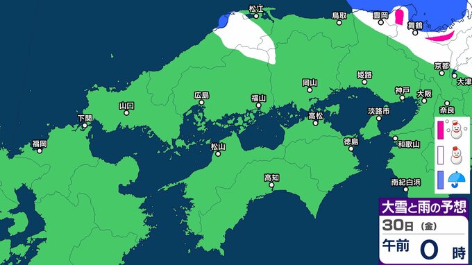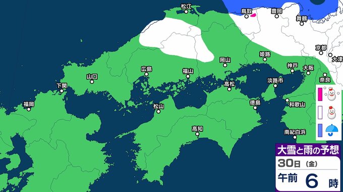 30日の広島県は、引き続き寒気や湿った空気の影響でおおむね曇り、北部では雪の降る所があるでしょう。
