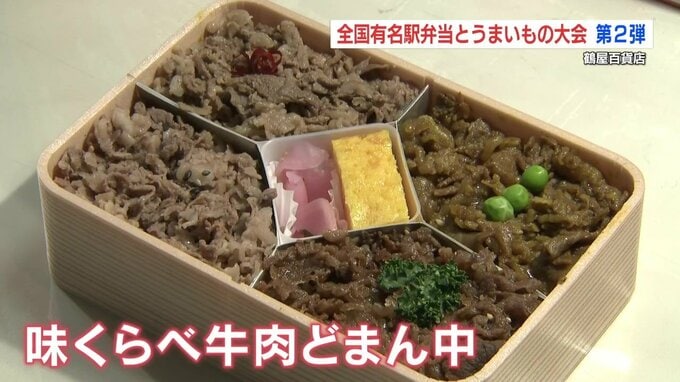 山形県からは、米沢駅の駅弁「味くらべ牛肉どまん中」が登場。ご飯が見えないほど名物の牛肉を敷き詰め、4種類の味付けをひとつの弁当で楽しめます。1日100個限定です。