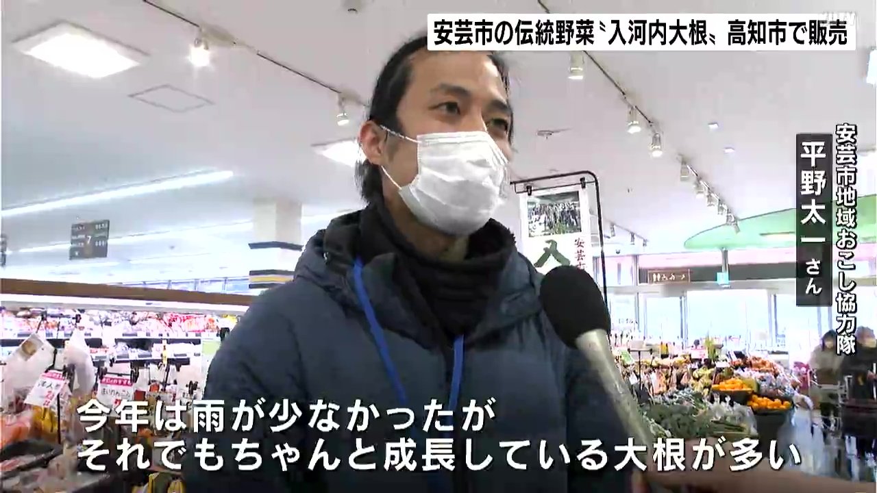 安芸市の入河内地区では、大きさや甘さが特徴の伝統野菜、「入河内大根」が栽培されています。ふだんは安芸市を中心に販売していますが、年に一度、生産者が高知市の量販店を訪れ、販売会を行っています。高齢化により出荷量は年々減少しているということですが、2026年は2000本ほどの出荷を見込んでいます。高知市ではなかなか店頭に並ばないこともあり、「販売を楽しみにしている」という人もいました。