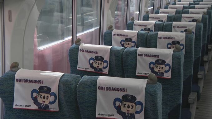 いたるところにドアラが描かれた「ドアラトレイン」。中部空港へのアクセス特急「ミュースカイ」の配色を青白反転させ、制服姿のドアラなどがデザインされているほか、シートのヘッドカバーまでドアラです。