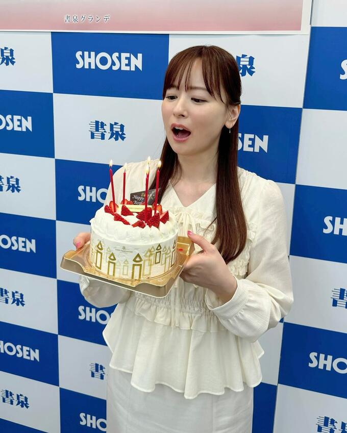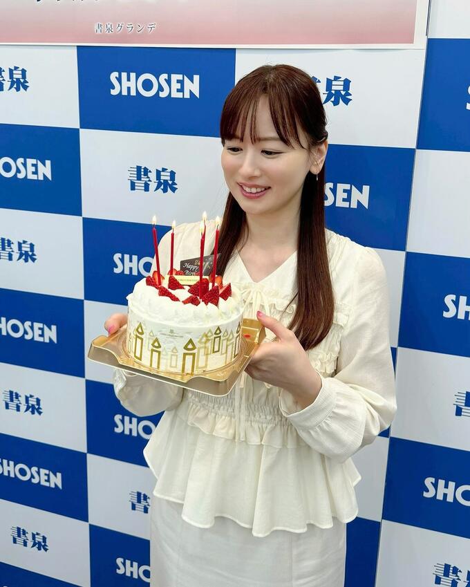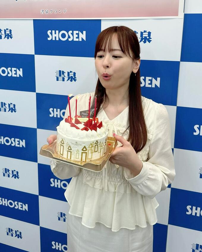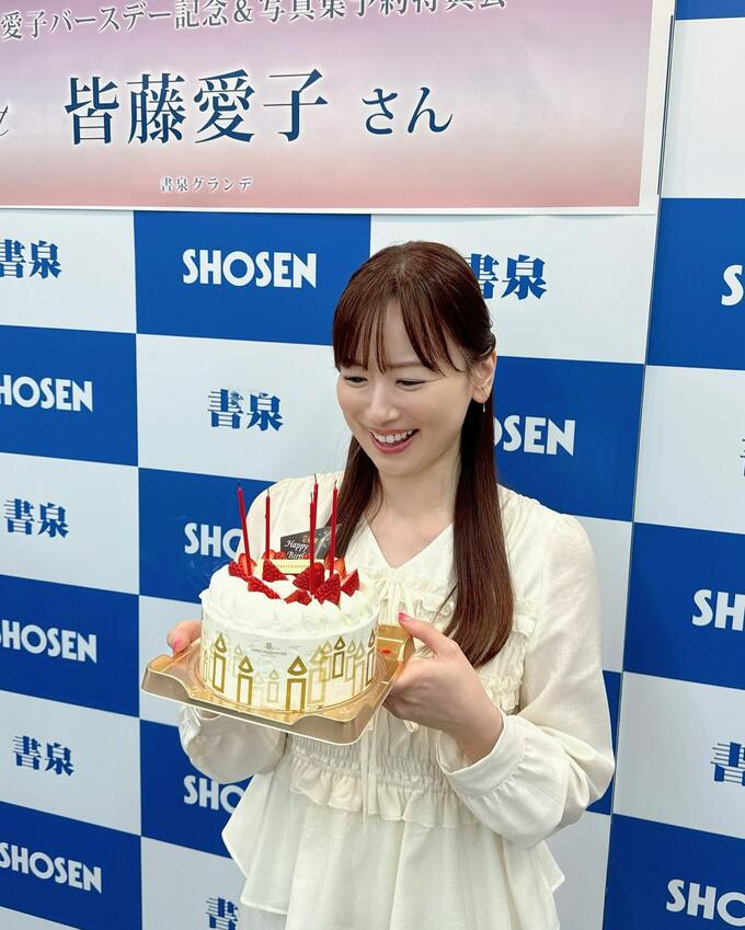 イベントでは、皆藤さんが白いブラウスを着用し、白いクリームのケーキを手に笑顔を見せる場面がありました。ケーキには赤いキャンドルや苺が飾られ、周囲には金色の装飾も施されていました。