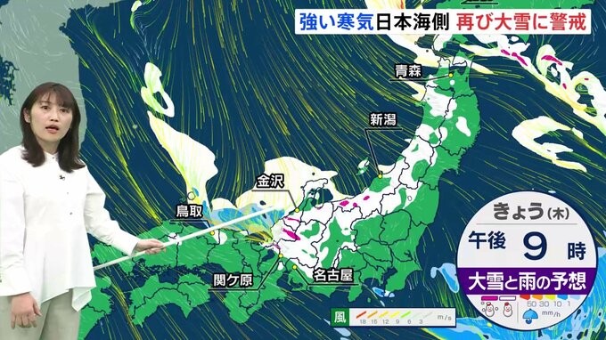 このあと、あすにかけてが寒波のピークとなりそうです。日本海で発達した雪雲が一段と活発になって、今夜は北陸地方にかかりそうです。また、あすになると近畿北部を中心に流れ込むでしょう。こういった場所では、…