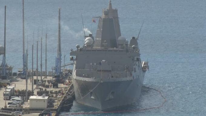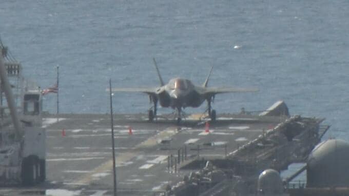 ホワイトビーチに寄港したのは長崎県・佐世保基地を母港とする米海軍のドック型輸送揚陸艦「ニューオリンズ」と強襲揚陸艦「トリポリ」の2隻です。28日午前、東側の桟橋に停泊し、このうち「トリポリ」の甲板の上にはステルス戦闘機F-35BとCH-53ヘリなどが搭載されているのが確認されました。
