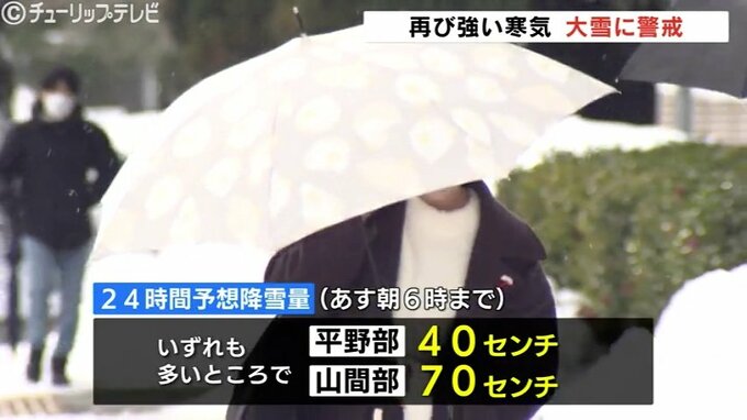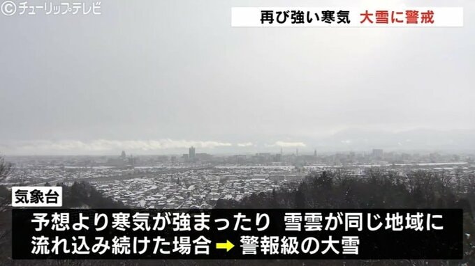 富山地方気象台は、山間部だけでなく、平野部でも大雪となるところがある見込みで、予想より寒気が強まった場合や、雪雲が同じ地域に流れ込み続けた場合には、警報級の大雪となる可能性もあるとしています。