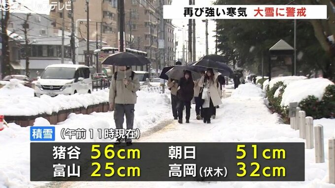 北陸地方の上空に強い寒気が流れ込んだ影響で県内は雪が降っています。午前11時現在の積雪は富山市猪谷で56センチ、朝日で51センチ、富山で25センチなどとなっています。