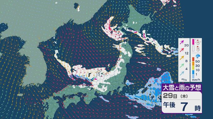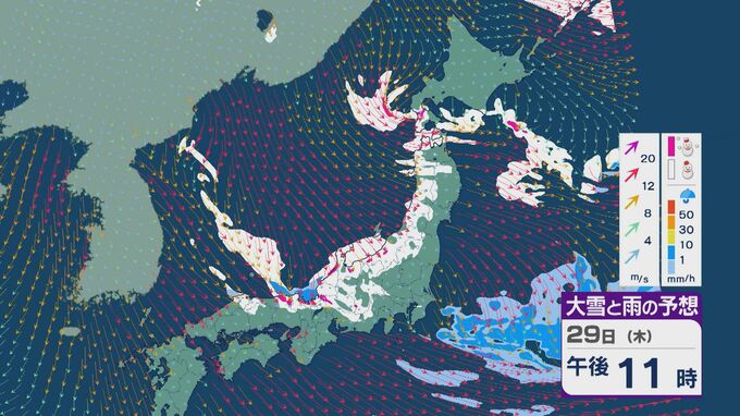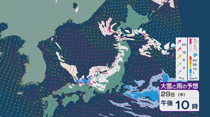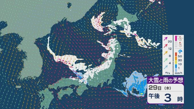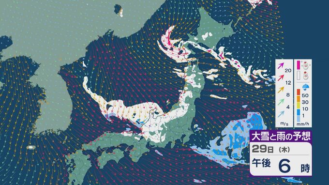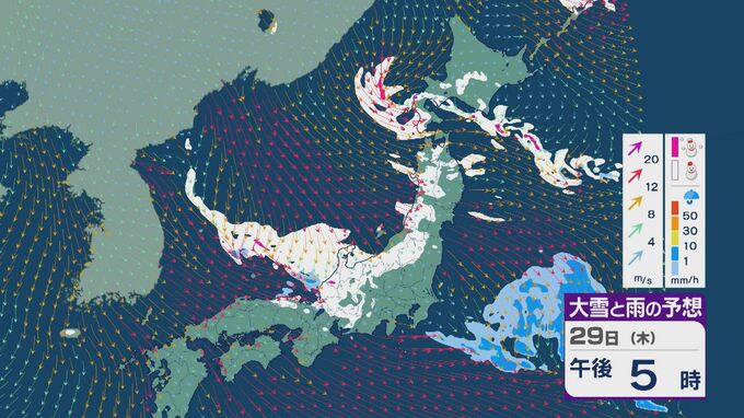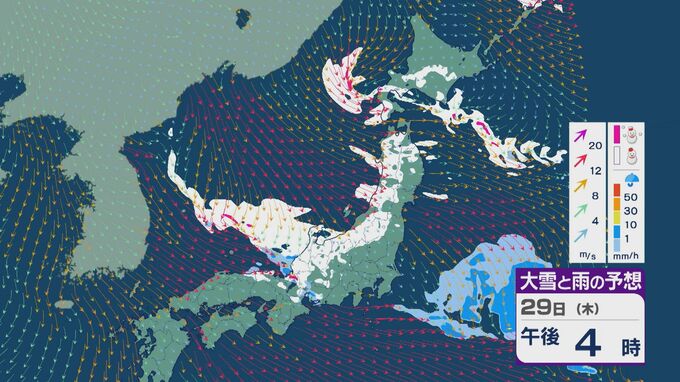 29日の雪と風の予想ですが、主に山陰から北陸、東北の日本海側、北海道で雪が降るでしょう。日本海で風が収束するJPCZ(日本海寒帯気団収束帯)により発達した雪雲は、西日本の日本海側や福井県にかかりそうです。石川県や福井県では29日夜のはじめごろから雪の降り方が強まりそうです。