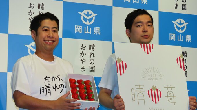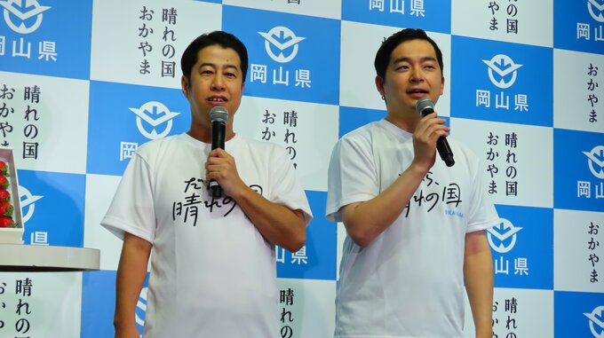 お笑いコンビ「ウエストランド」の井口浩之さんと河本太さんが、東京・新橋にある「とっとり・おかやま新橋館」で行われた『だから、晴れの国』レアいちごが主役!特製晴苺パフェお披露目」記者発表会に登場しました。